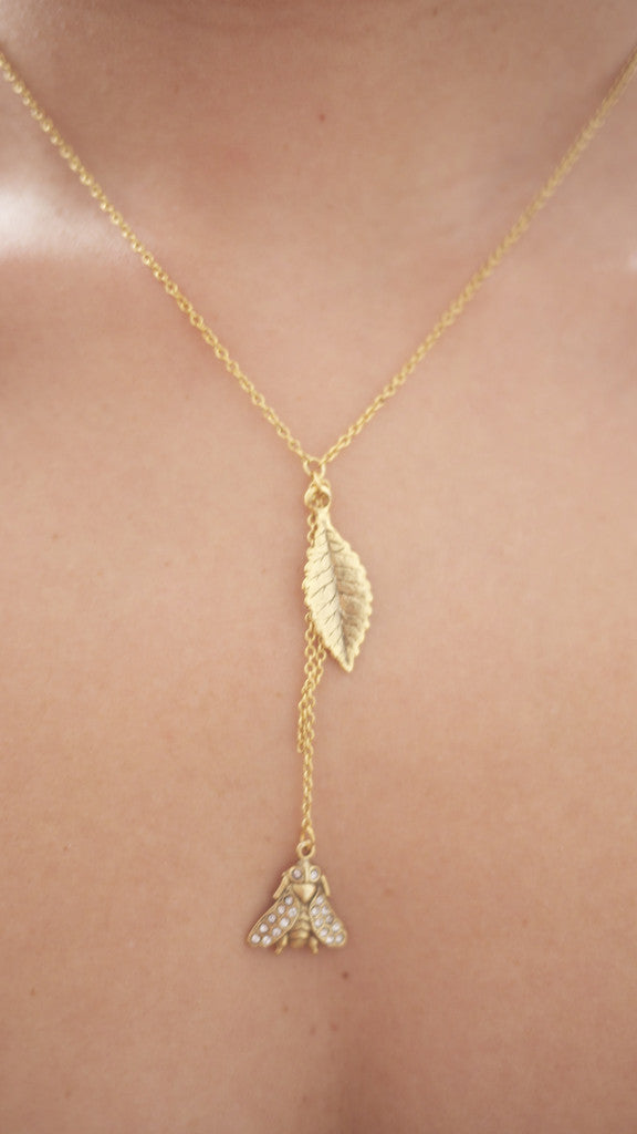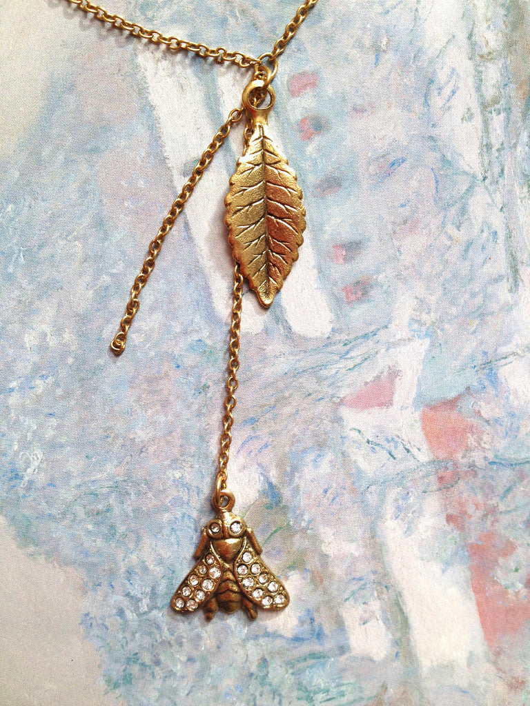 Sweet leaf charm hangs off a 16" delicate cable chain necklace. A small detailed bee charm with tiny crystals to add a little sparkle drops 2 inches bellow.