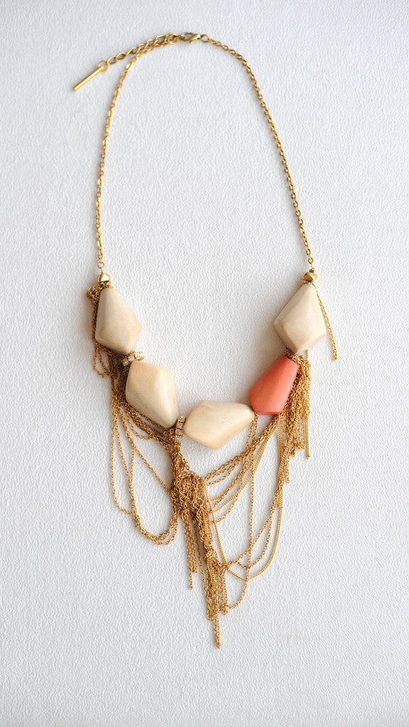 Ivory and peach-toned geometric wooden beads are strung with an elegant tangle of delicate gold chains and Swarovski crystal rondelles.