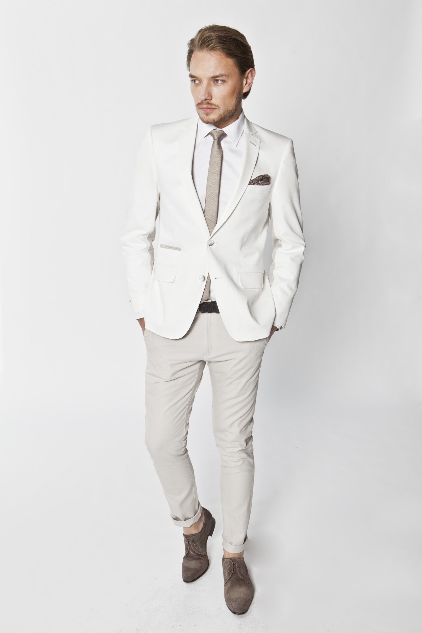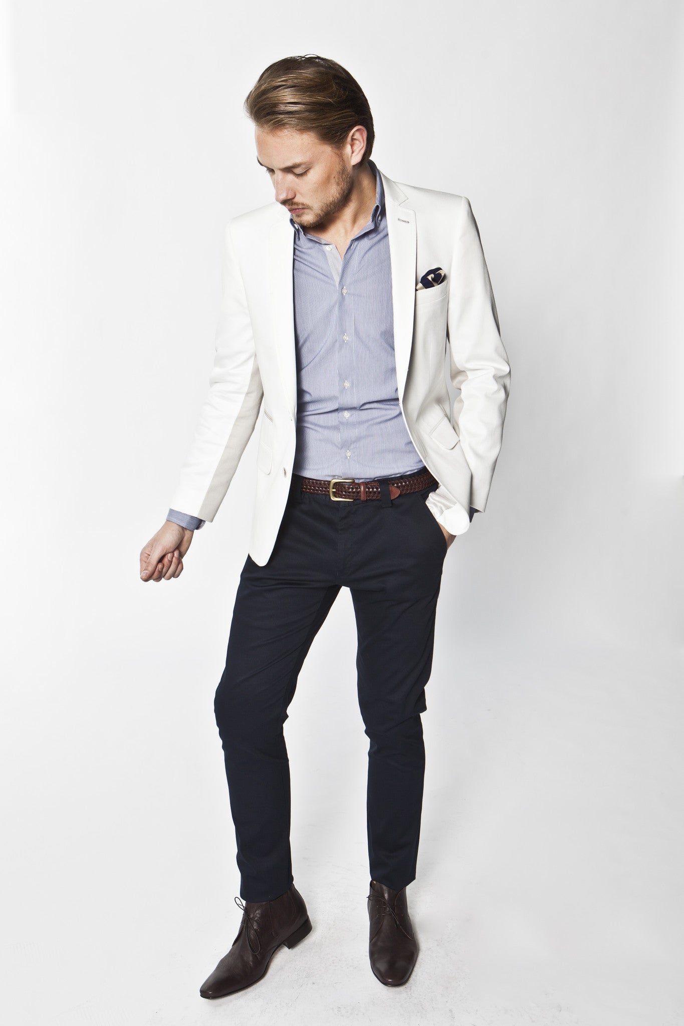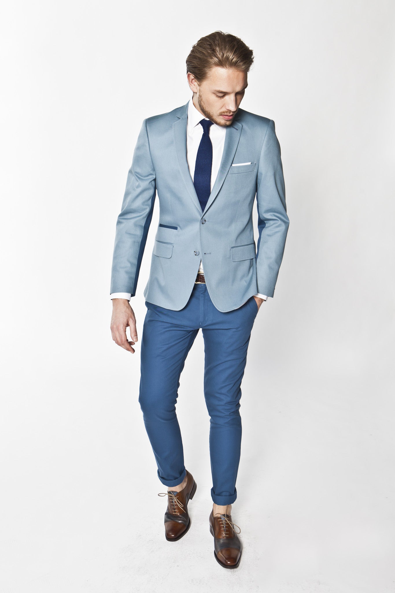 Narrow notch lapel, Slim cut jacket, contrast undersleeve and jetted ticket pocket design, 100% Japanese cotton, Made in Australia.