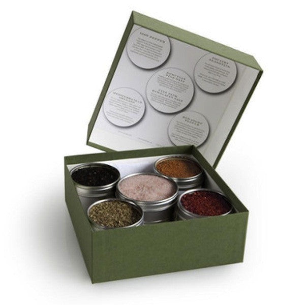 Includes: Red Stamp Pepper, Isot Pepper, Mediterranean Oregano, Sumac, Coarse Himalayan Pink Salt and Alaea Hawaiian Sea Salt. Nestled in a beautiful box, this unique set is the perfect gift for any home cook or chef.