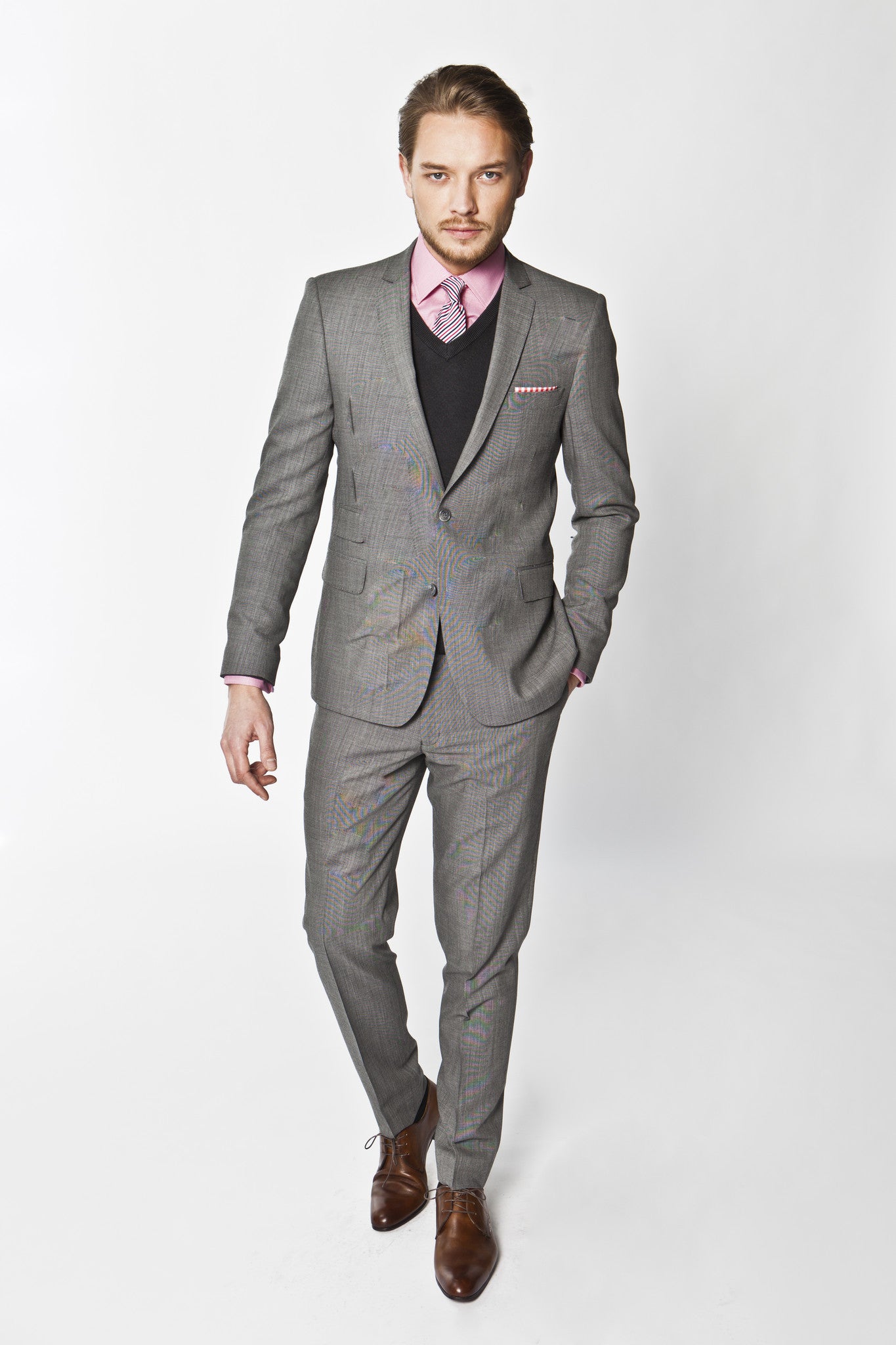 The Miro Suit is a moden slim lapel jacket which is worn with the matching Max trouser. The jacket features a slim narrow notch lapel, two front buttons, ticket jet in satin, side vents & beautifully detailed internal linings and trims. The trouser is a low-rise, slim leg trouser that compliments the slim silhouette of the jacket perfectly. Made from 100% wool.